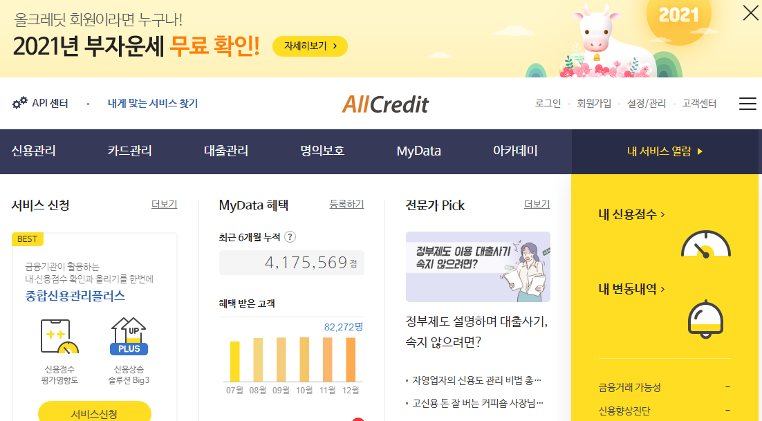 2020.12.25일 기준 현재 올크레딧 사이트 첫페이지 이다.