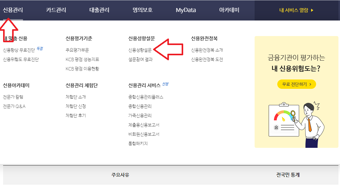 신용점수를 올리기 위해서 아래 신용관리- 신용성향설문에 들어가서 100문항의 설문을 한다.