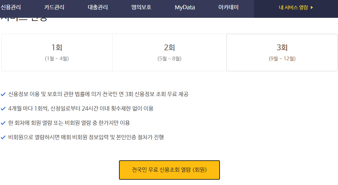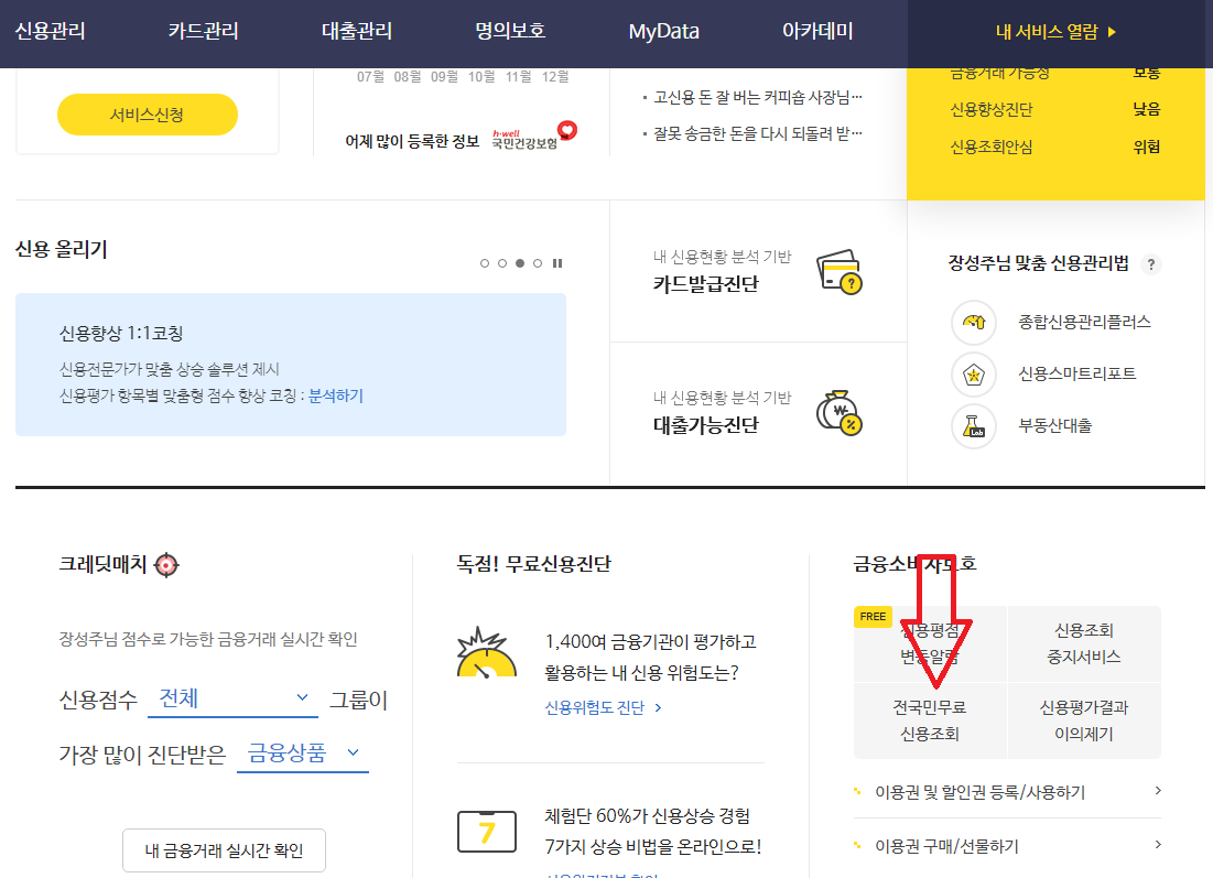 클릭하면 이렇게 페이지가 뜨게 되는데, 전국민 무료 신용조회 열람을 누른다.