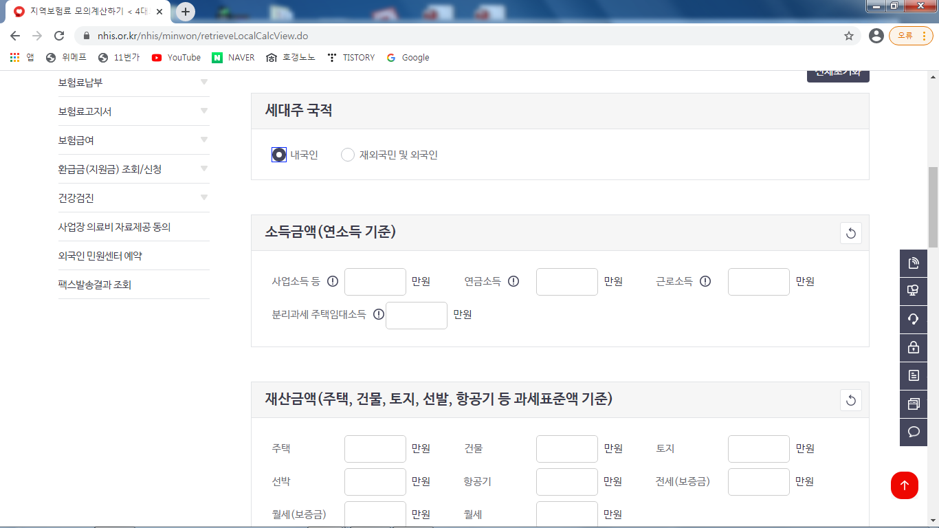 건강보험공단 사이트에 들어가서 지역건강보험료를 모의 계산할수 있다.