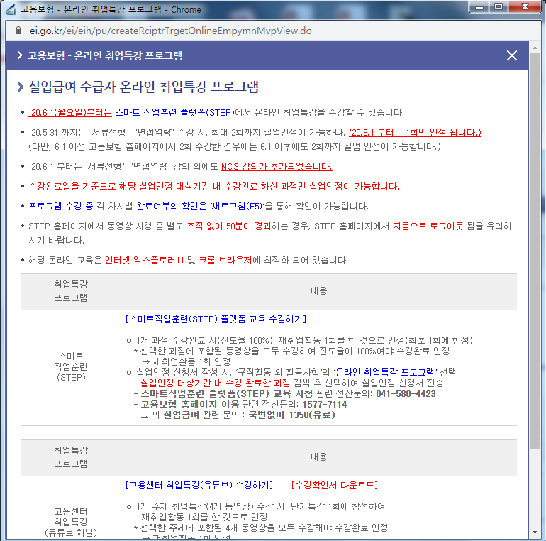 원래는 1~3차까지 고용센터에 방문하여 집체교육을 받아야 했으나 코로나로 인해 인터넷으로 동영상 1개를 보게 되면 구직활동 1건으로 인정해준다.