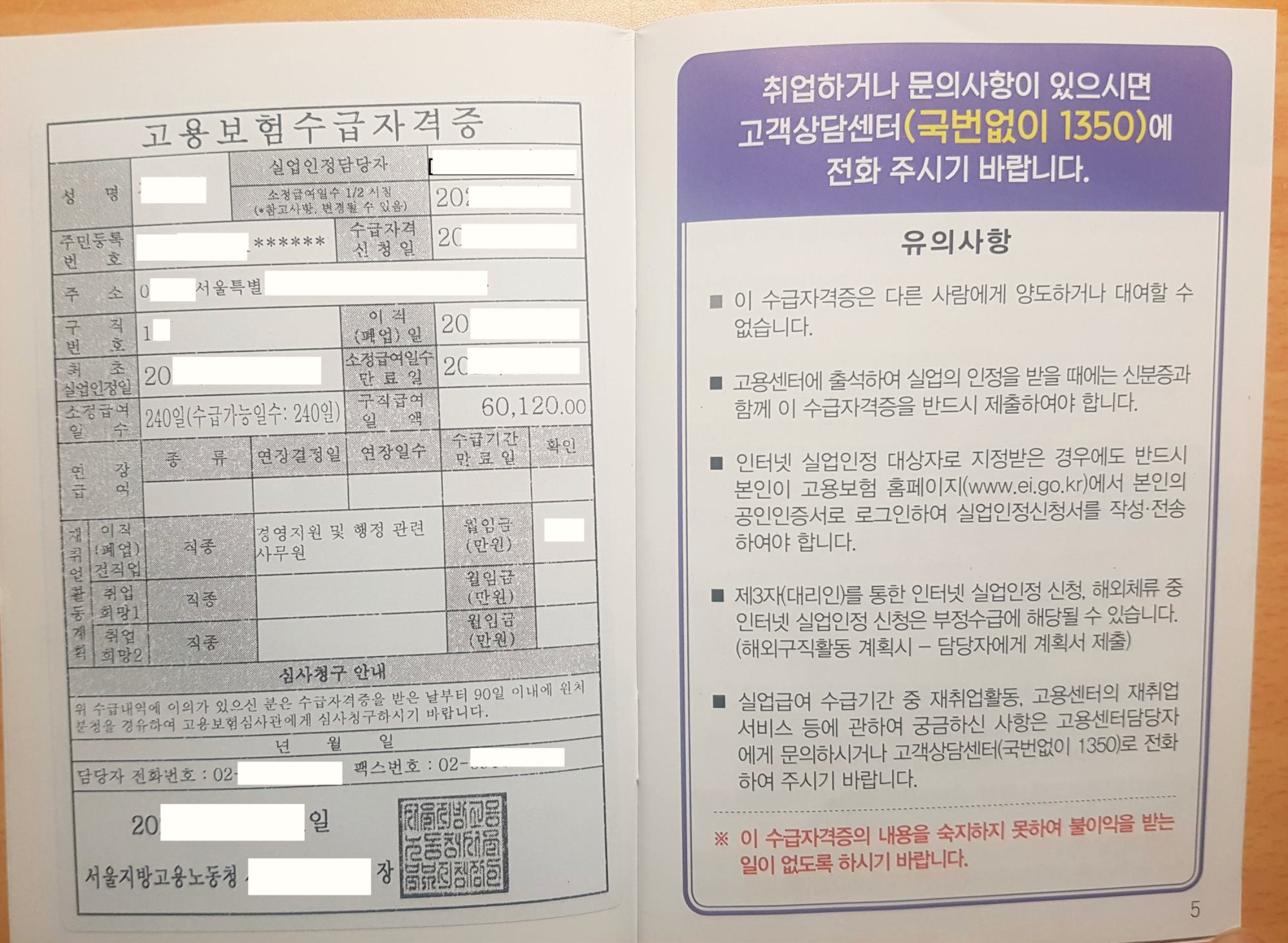 첫페이지를 펼쳐보면 본인의 정보가 기재되어있는데 실업인정담당자와,수급자격신청일, 최초실업인정일, 소정급여일수 만료일, 소정급여일수, 구직급여 일액등이 모두 기재되어있다.
