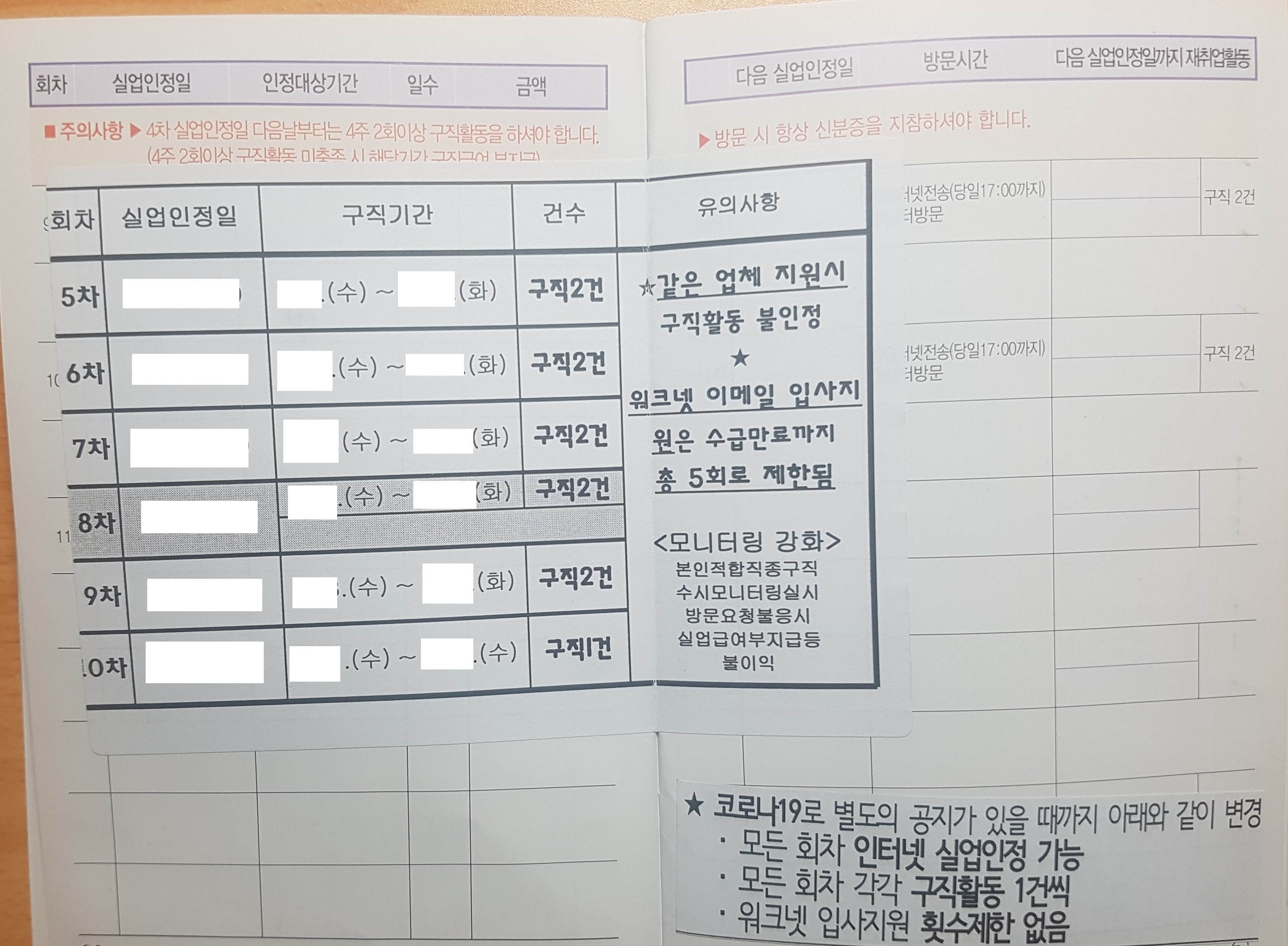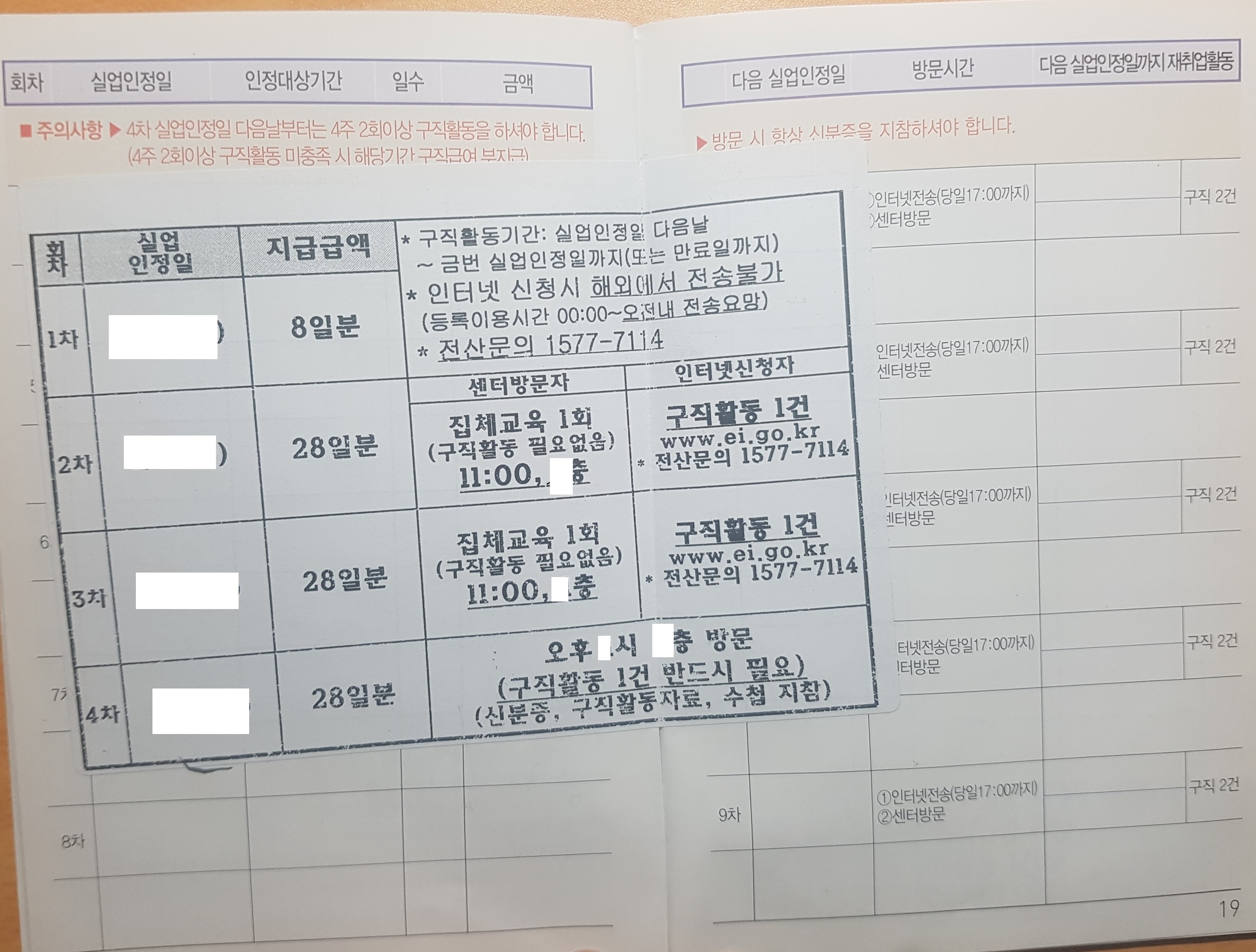 중간쯤펼쳐보면 회차별로 실업인정일이 기재되어있고, 각 날짜에 해야할 일이 기재되어있다.