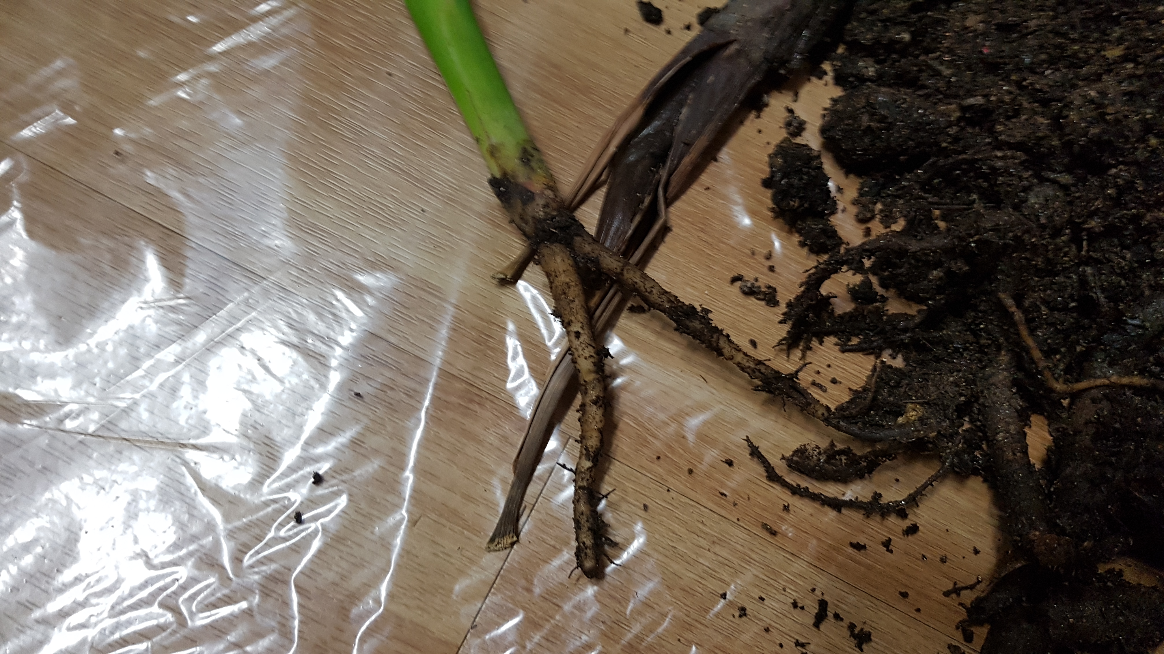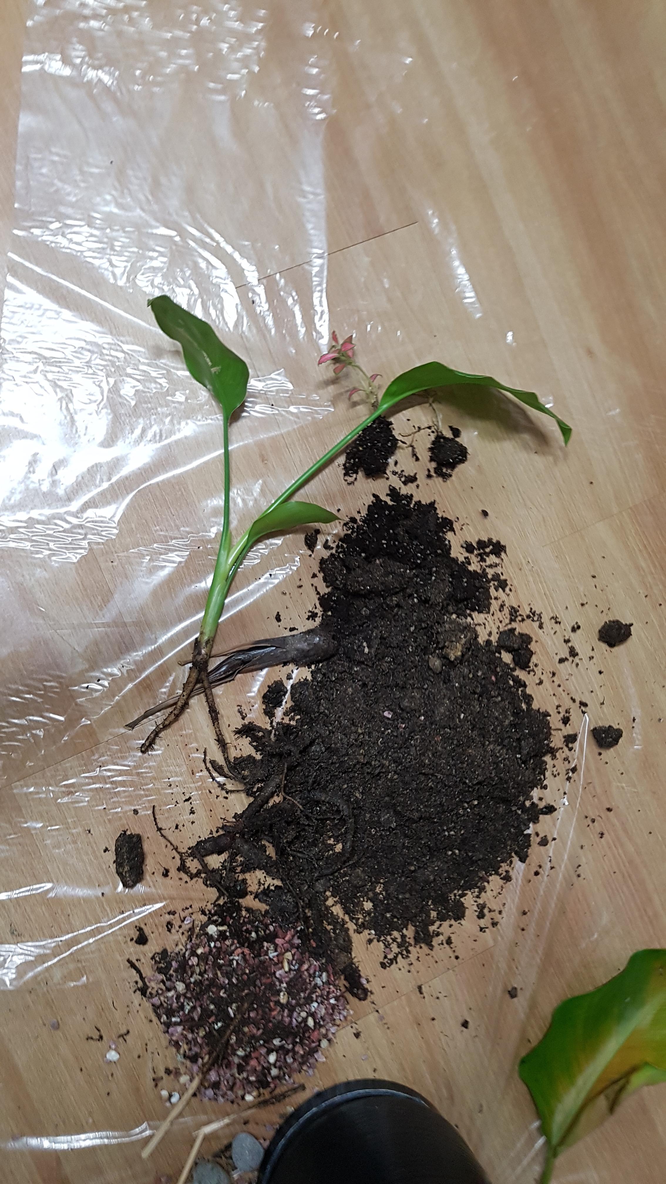 흙을 교체하기 위해 뿌리가 손상되지 않도록 조심조심 흙을 덜어 여인초를 바닥에 눕혀 보았다.