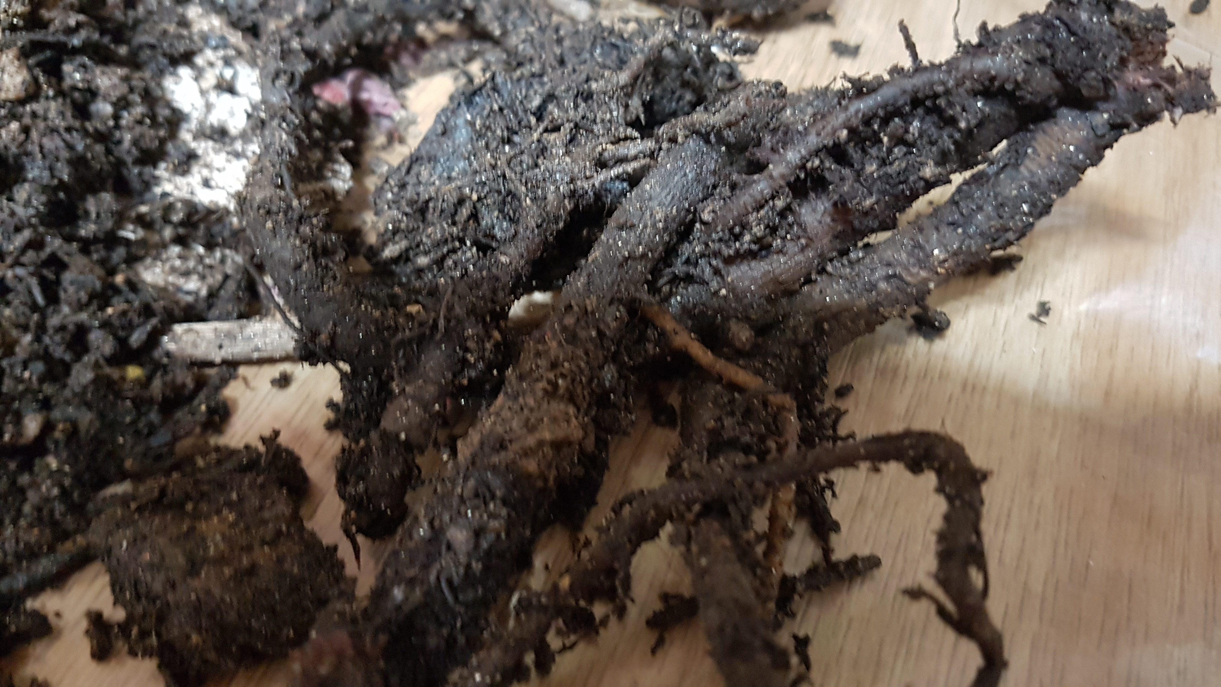 흙옆에 보이는 시커먼 도라지 같은 뿌리가 다 죽어 썩기 직전의 상태이다.