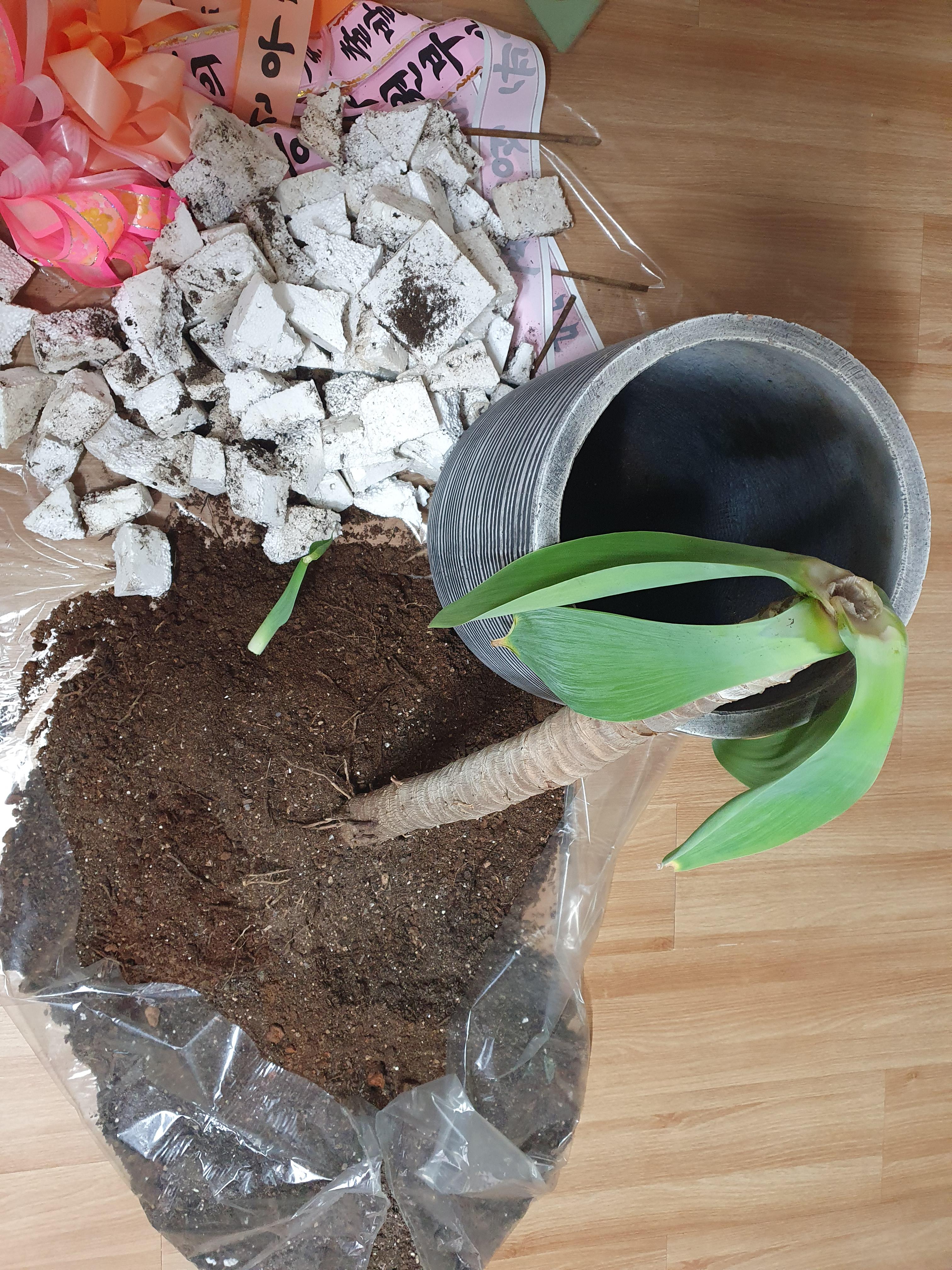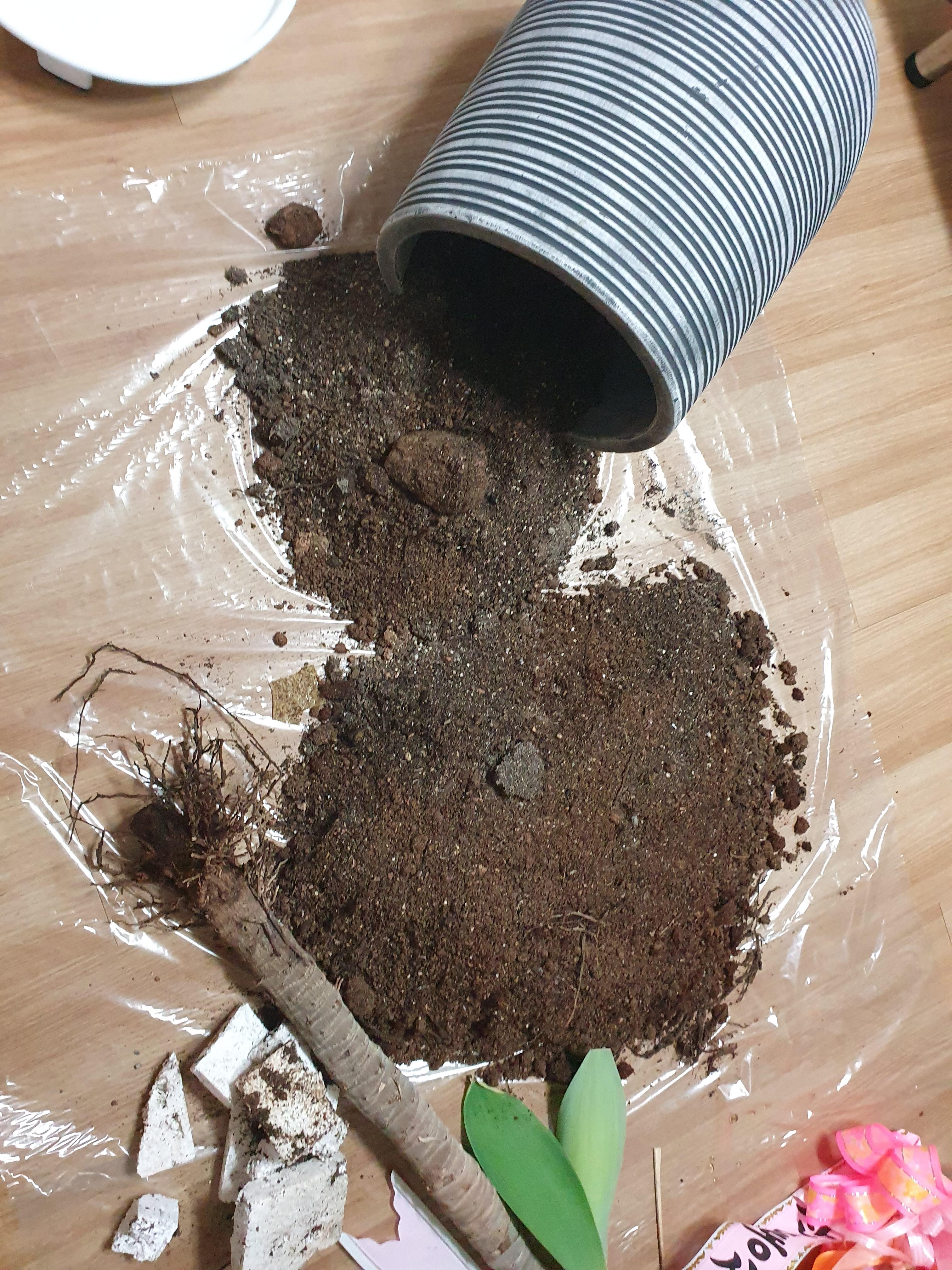 바쁜 아침이지만, 바닥에 넓은 비닐을 깔고 혼자 들수도 없는 무거운 화분을 부랴부랴 낑낑대며 비닐위로 옮겨 흙을 쏟아